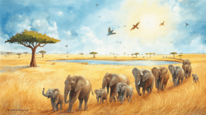 A Family of Elephants On the wide savanna of Africa lived a young elephant named Lila. She had large flapping ears, a long trunk, and eyes full of curiosity. Lila loved her herd—a close family led by her grandmother, the matriarch. Elephants always traveled together. They ate together, rested together, and protected one another. The… Read more: Elephant’s Long Journey | Around the World Bedtime Story